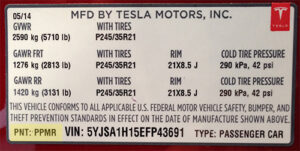 Tesla har vanligvis en etikett på førersidens dørstolpe. Denne etiketten inneholder flere opplysninger om bilen, inkludert fargekoden.